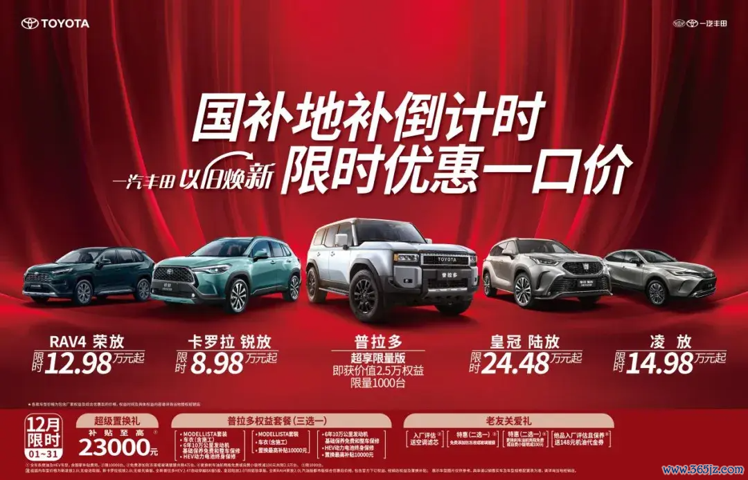 紧随后来的,则是一汽丰田通知12月份“国补地补以旧焕新限时优惠一口价”行动开启,至高可享2.3万超等置换补贴,另有丰厚入厂、选藏礼品及多重金融政策。
